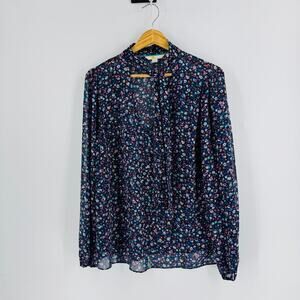 Boden sheer multicolor floral blouse featuring a tie-neck detail, lightweight airy fabric, and relaxed long sleeves with subtle gathers. The semi-transparent material creates a soft, floaty silhouette—perfect layered over a camisole for work, dinner, or elevated casual wear. Vibrant mini floral print adds a playful touch while remaining classic and polished. Marked US 14; see measurements for best fit.