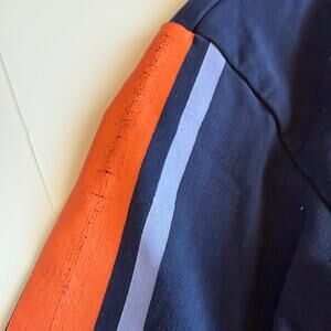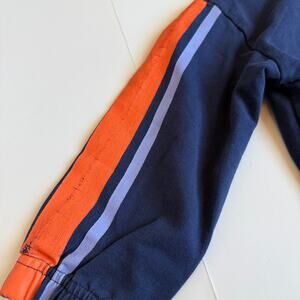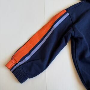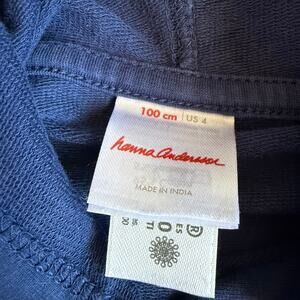 Size 100 cm US 4, Hanna Andersson navy blue love always hooded French Terry long sleeve top. 95% cotton 5% spandex. Good/fair used condition for wash wear. Most prominent down the side stripes. See close up photos.
