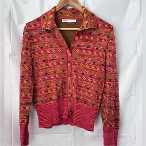 Zara Knit Jacquard Cactus Collared Button Cardigan Sweater
