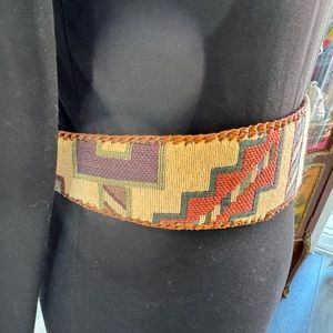 Really cool aztec print fabric graduated belt ( thicker in back, smaller in the front) faux leather belt. In really great condition. Neutral toned and beautiful southwestern style. Made in Guatemala. Marked as a size S.