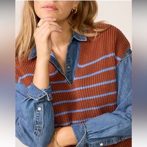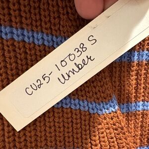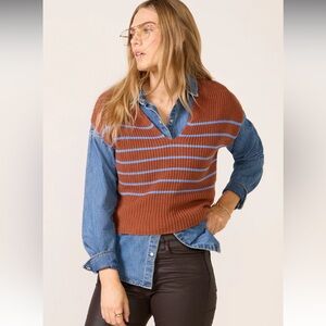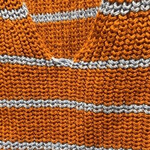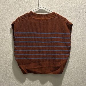 Stylish vest with a V-neck. Features brown and blue stripes. Perfect for casual wear.