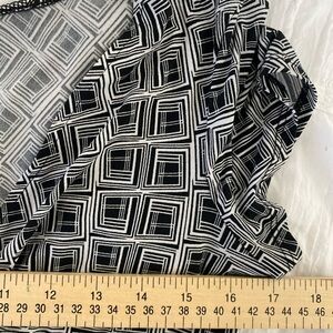 This London Times women’s dress in size 6 features a timeless black and white geometric print with a flattering faux wrap design. Styled with cap sleeves and a surplice V-neckline, this dress creates an elegant and slimming look. Ruched detailing at the waist enhances the silhouette, while the A-line skirt falls gracefully to knee length.