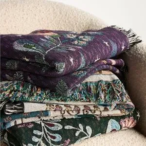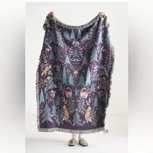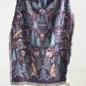 Charming throw with forest animal design. Features foxes and trees. Rich purple and green tones. Perfect for cozy decor.