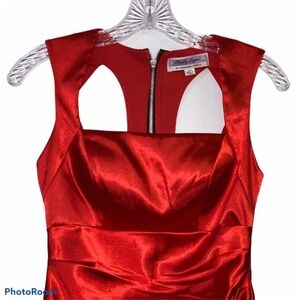 Red satin like formal/party dress by Hailey Logan by Adrianna Papell. Zip up back. Size 3/4. Excellent condition. Most of my items come from church, estate or yard sales so I can't say if they are smoke free. We are a pet friendly home. Excellent condition and great Holiday Dress.