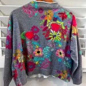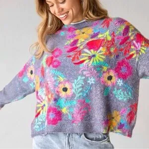Add a pop of color and cozy charm to your wardrobe with this Natural Life fuzzy pullover sweater. Made with a cashmere-like soft feel, this sweater features a vibrant colorful floral pattern that’s perfect for brightening up cooler days.