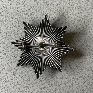 Textured silver tone metal starburst pin. Acrylic pale turquoise blue cabochon accents. Tiny faux pearl center. Likely 1940’s or 1950’s