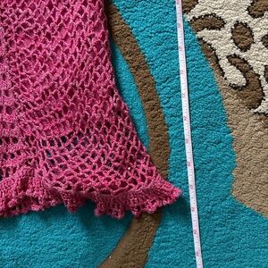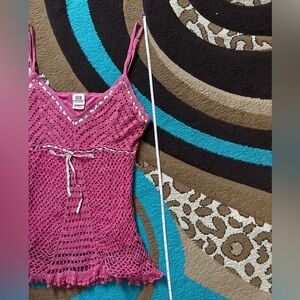 Stylish crochet design with ribbon accents. Ideal for layering.