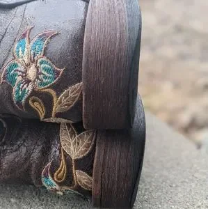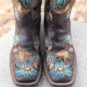 MACIE BEAN Ladies embroidered western boot. Style #M9034. Dark brown leather with a glitter glaze. Floral embroidery all over boot in gold, ivory, brown and turquoise blue shades. Tall 13 inch shaft, cushion insole, double stitch square toe, roper heel, leather outsole, fully lined in soft red pigskin leather.