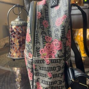 Elegant Juicy Couture backpack with logo and floral pattern. Black and pink design. Ideal for daily wear.