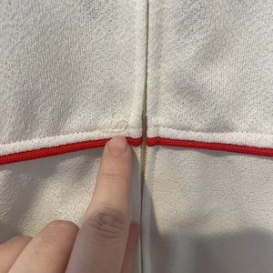 Loose thread on back by zipper, shown. Zips up and down with ease.