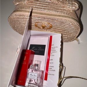 Brand new! Was a part of the holiday collection included in one of their makeup gift sets. This was one of those From Me, To Me moments… Includes the 4 sample scents as pictured: Mancera Rose Vanille, Cartier l’heure diaphane, miss Dior essence, miss Dior blooming bouquet placed inside that cute lil holiday box.