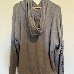 Chic gray hoodie with bold black lettering. Features a comfortable fit and stylish design.