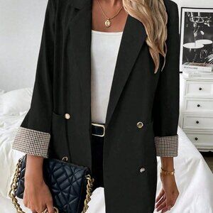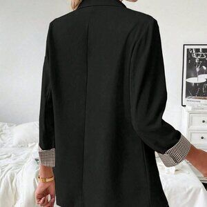 Elegant Black Women's Plaid Sleeve Trim Blazer