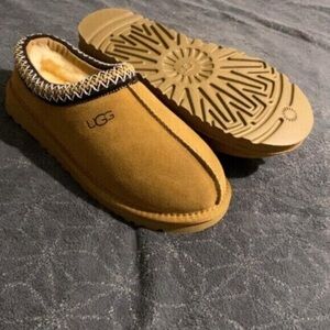 Comfortable UGG slippers. Tan with black accents. Ideal for cozy wear.