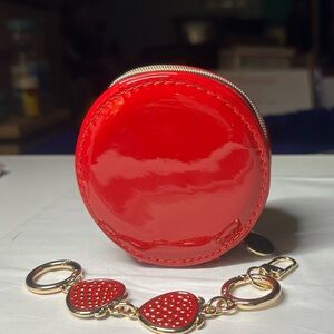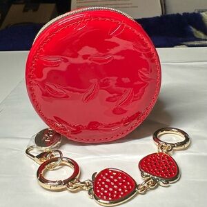 Glossy red, round, cosmetic purse or makeup pouch with embossed lip design by YSL features the iconic YSL Beaute’ logo on the zipper pull/charm. The bag extender with strawberry design added to be able to clip onto a bag and Voila! Pouch becomes a bag charm which can also be used as a coin purse or travel jewelry case. Ideal for small essentials. Measures 3.5 inchew in diameter. This has never been used, comes in a clear plastic packaging and bag extender. This was also a gift with purchase (GWP) of YSL beauty items. Please see the GWP disclosure information on attached image.