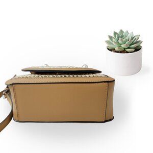 Steve Madden structured crossbody bag featuring a woven straw-style exterior accented with pearl and faceted bead embellishments. Designed with smooth tan faux leather trim, a top handle, flap closure, and a detachable adjustable crossbody strap with chain detail.