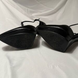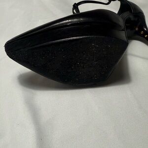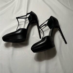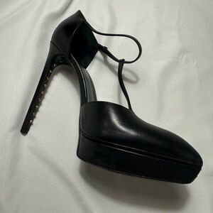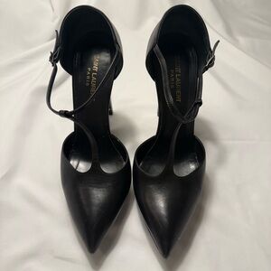 Chic Saint Laurent heels in classic black. T-strap style with gold grommet detail on the heel. Perfect for elevating any outfit. Original box included size 41