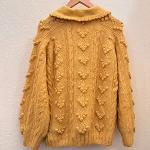 Design: textured cable + floral knit detailing, statement buttons, front pockets