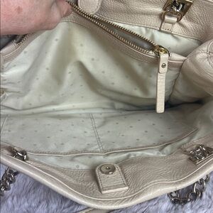 Elegant cream tote with chain and leather straps. Spacious interior. Perfect for everyday use. Natural creasing throughout but this nice very clean bag. Looks lighter in the pictures but it is a tan color. I am throwing in a tan Coach wallet. Matches perfectly.