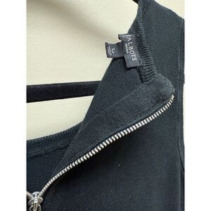 This Talbots Sweater Dress is a stylish and versatile option for women in a size LP. The dress features a bold black and white striped pattern, a sleeveless design, and a round neckline with a zip closure. Made from a blend of rayon, spandex, cotton, and nylon, the dress has a comfortable stretch and is machine washable for easy care. With a mid-length hem and a colorful theme, this sweater dress is perfect for the winter, fall, and spring seasons, making it a fashionable choice for any occasion.