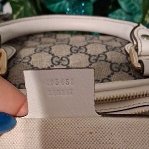 Elegant Gucci satchel with iconic pattern. Beige canvas with bold red accents. Perfect for any occasion.
