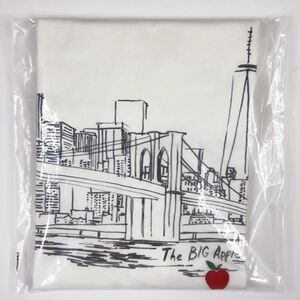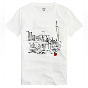 J.Crew The Big Apple Graphic Crisp White T-shirt - A black & white sketch of the New York City skyline, including the Brooklyn Bridge & One World Trade Center, with the text "The BIG Apple" & a prominent embroidered red apple 🍎 graphic.