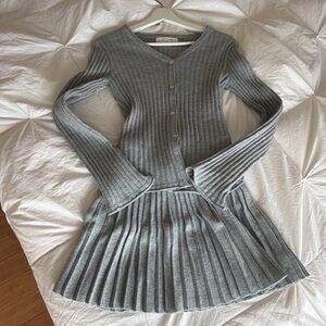 Elegant heather gray knit set. Includes a cozy cardigan and matching skirt. Ideal for a sophisticated ensemble. Regular fit