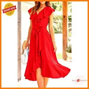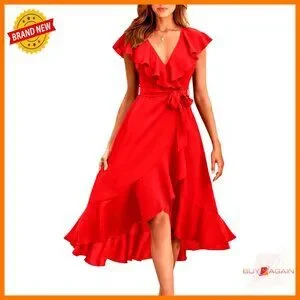 Satin Midi Dress Elegant Boho V Neck Ruffle Hem Split Front Summer Beach