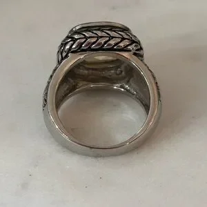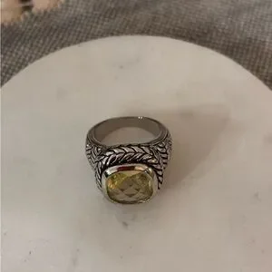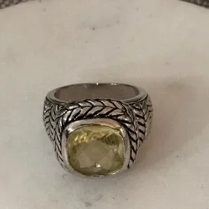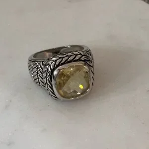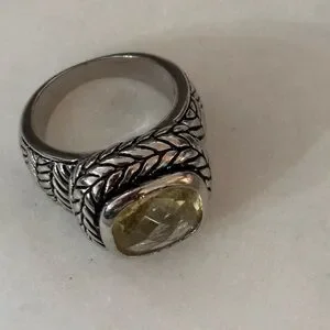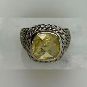 Elegant silver ring featuring a yellow gemstone. Intricate braided design adds sophistication.