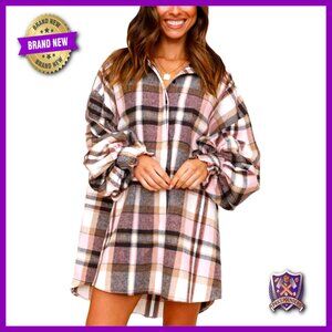 Oversized Flannel Button Down Shirt Dress Boho Chic Long Sleeve Tunic Top
