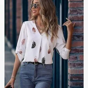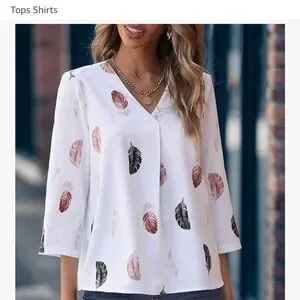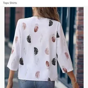 Elevate your style with this chic women's blouse featuring a delicate feather print. The soft white fabric is adorned with subtle black and pink feather designs, perfect for any occasion.