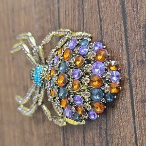 Spider Rhinestone LARGE Brooch, Rhinestones throughout. Gold tone legs with lilac stone. Body orange, lilac, dark stone, black eyes. Brooch / Pendant. Measures 4" in length.