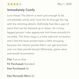 Love these! The denim is worn just enough to be immediately comfy and I love the fit through the leg with the stitching details. Definitely feel like a pair of jeans that can be dressed up or down. As a long-legged person I also appreciate that these actually hit my ankle. The front clasp is a little odd with no button and I find the back pocket style a little annoying because the interior pocket fabric can get bunched and ruin that smooth booty! Otherwise, great value and would recommend.