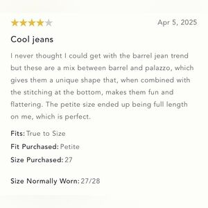 I never thought I could get with the barrel jean trend but these are a mix between barrel and palazzo, which gives them a unique shape that, when combined with the stitching at the bottom, makes them fun and flattering.