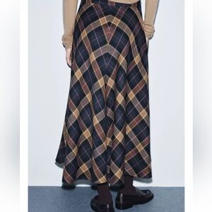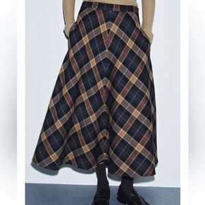 Zara Check Cape Skirt in the ZW Collection Limited Edition, featuring a navy blue, sepia beige, and brown plaid pattern