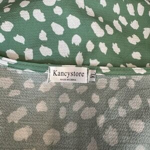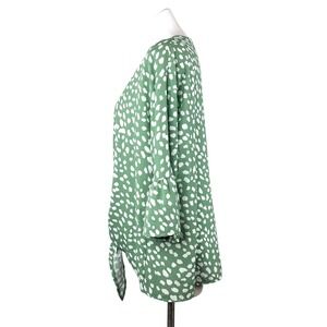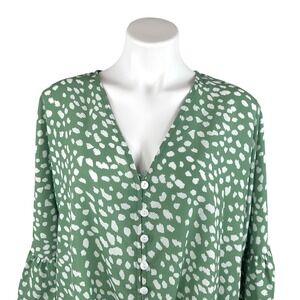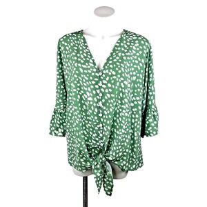 Kancystore XL Blouse Green White Button Down Tie Knot 3/4 Bell Sleeve V Neck