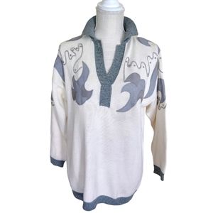 Vtg 80's 90's Ann Wi Sweater Leather Bead Accents Gray Cream Pop Art Size Medium