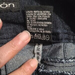 Stylish denim shorts featuring a high waisted design and a unique button fly closure. These dark wash shorts are embellished with rhinestone studs along the front pocket area, adding a touch of sparkle and flair. The cuffed hem provides a casual, yet polished look. Perfect for pairing with a crop top for a concert, or dressing down with a tee for a casual day out. Right rear Metallic Logo tag. NO ACTUAL POCKETS.