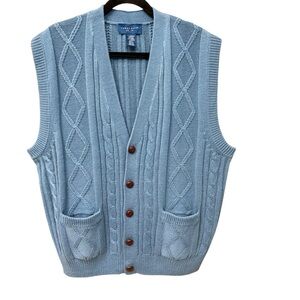 EUC vintage Towncraft sweater vest featuring classic cable knit detailing in a soft blue tone. Button-front design with ribbed trim and front pockets. Sleeveless knit layer with a relaxed fit—perfect for grandpa core and Ivy League–inspired styling, worn solo or layered over a shirt.