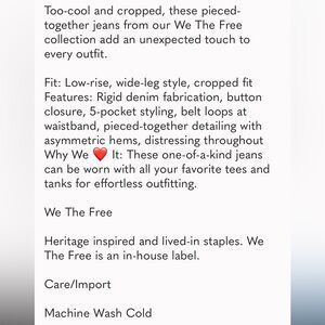 We the Free Ripple low rise, wide leg, cropped distressed rigid denim with button fly