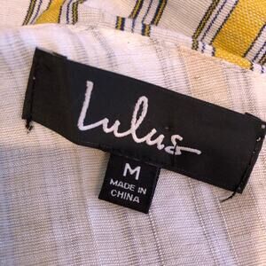 Lulus High Tide ivory white yellow striped ruffle one shoulder dress. One shoulder ruffle neckline. Faux wrap ruffle high low hem skirt. Belt that ties at waist. Zips on side. Fully lined. Size Medium. Excellent preowned condition. Minor wash wear.