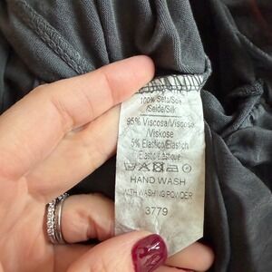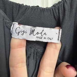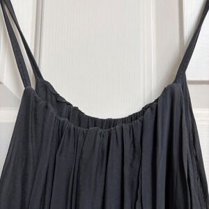 Gigi Moda gray midi dress crafted from a luxurious silk. This sleeveless dress features a gathered neckline that stretches and thin straps and a flowing silhouette. The fabric has a crinkled texture adding visual interest, and the hemline is finished with a delicate sheer overlay.