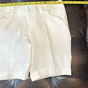 These Alice + Olivia women's size 6 cotton shorts in white feature a solid pattern with a zip closure and cuffed accents. The versatile shorts are perfect for travel, parties, casual wear, and more. Made from comfortable cotton material, they have a regular fit and are designed for everyday activities like walking, dancing, and beach outings. The classic yet designer style of these shorts makes them a perfect addition to your summer, fall, or spring wardrobe.