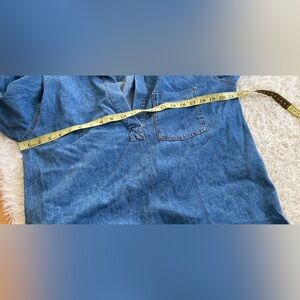 This is a V-neck shirt with a patch pocket and back yoke. It's cut from lightweight and drapey non-stretch denim with a soft feel. This version comes in a medium indigo wash with a clean hem.