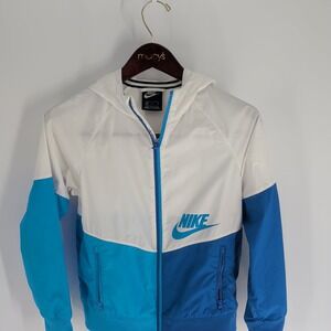 Keywords: Nike Windbreaker, Full Zip Hooded Jacket, White Blue Track Jacket, Performance Womenswear, Dri-FIT Technology, Athletic Style