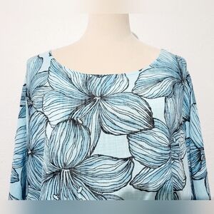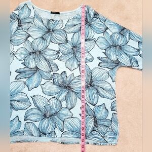 Beautiful Made in Italy tunic top in a soft, breathable 100% cotton fabric. Features an artistic floral print in shades of blue on a light aqua background. Relaxed oversized fit with 3/4 length sleeves and a flattering tunic length hem.