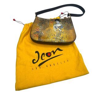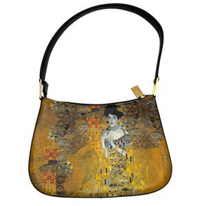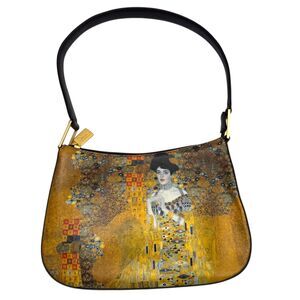 ICON Los Angeles wearable art small shoulder bag inspired by Gustav Klimt’s famous Portrait of Adele Bloch-Bauer I, often called The Lady in Gold. The gold mosaic artwork and portrait detail give this bag a striking, gallery-worthy look while keeping a clean, minimal shape.