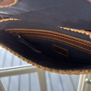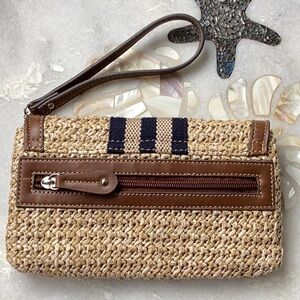 This woven wristlet has room for all your important things. It has an exterior snap closure and a zippered pocket on the interior. The blue, tan and brown colors are classic for summer! 8.5” L x 5” H x 1” W. It is in good pre loved condition.