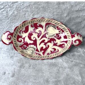 Elegant Amita decorative dish featuring a bold deep red ground, ornate cream scrollwork, and gold gilt detailing, finished with integrated side handles and a softly scalloped edge.