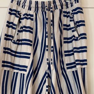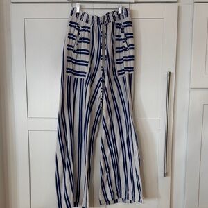 Elevate your style with these chic wide leg pants. Featuring a striking blue and white striped pattern, these pants offer both comfort and elegance. Perfect for any occasion.